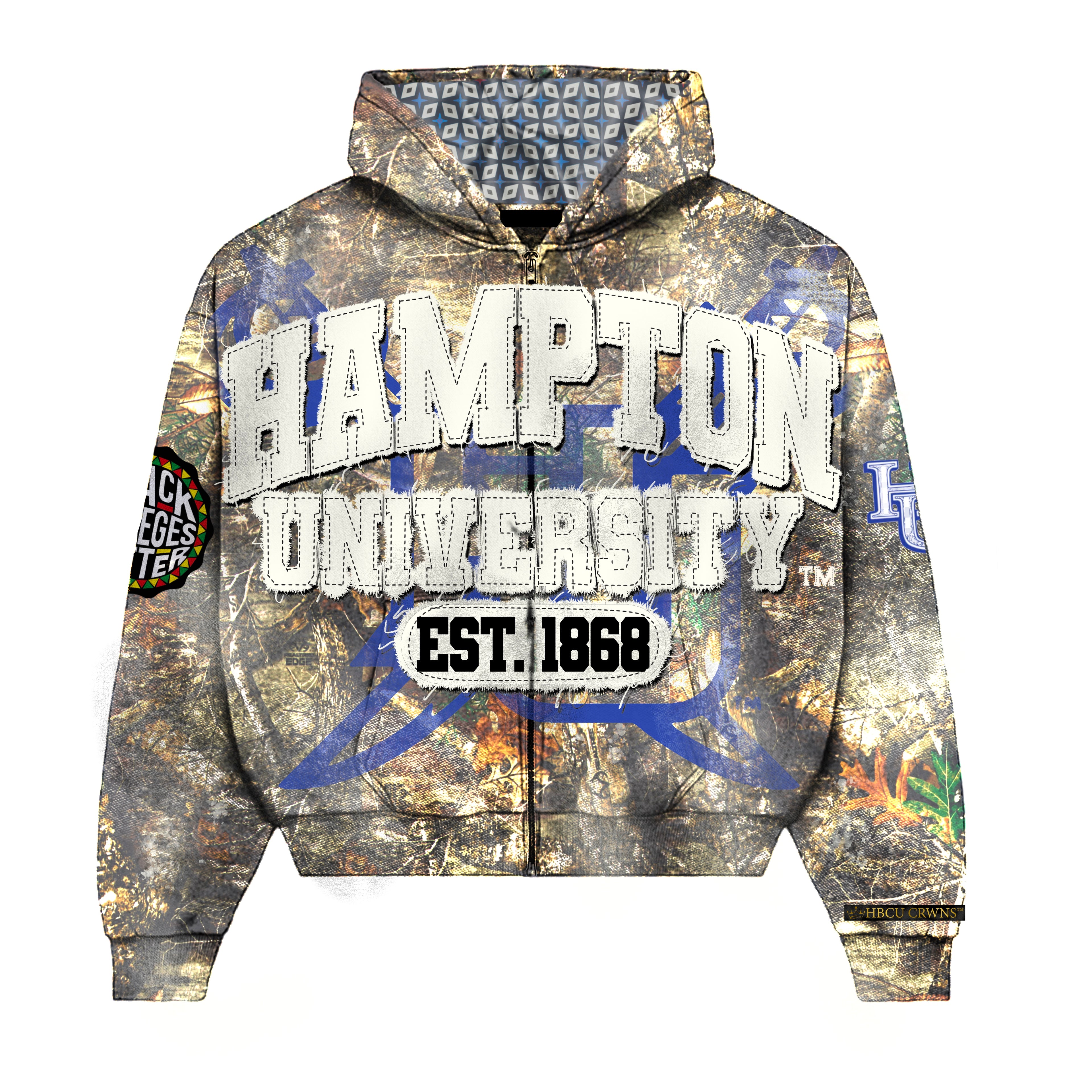 RealTree Camouflage French Terry Cotton with crisp white appliqué details and a silk-infused hood lining for crown protection. Back reads: “One Pirate Could Change the World.” Designed for the yard, Convocation spirit, and Hampton Homecoming nights.
