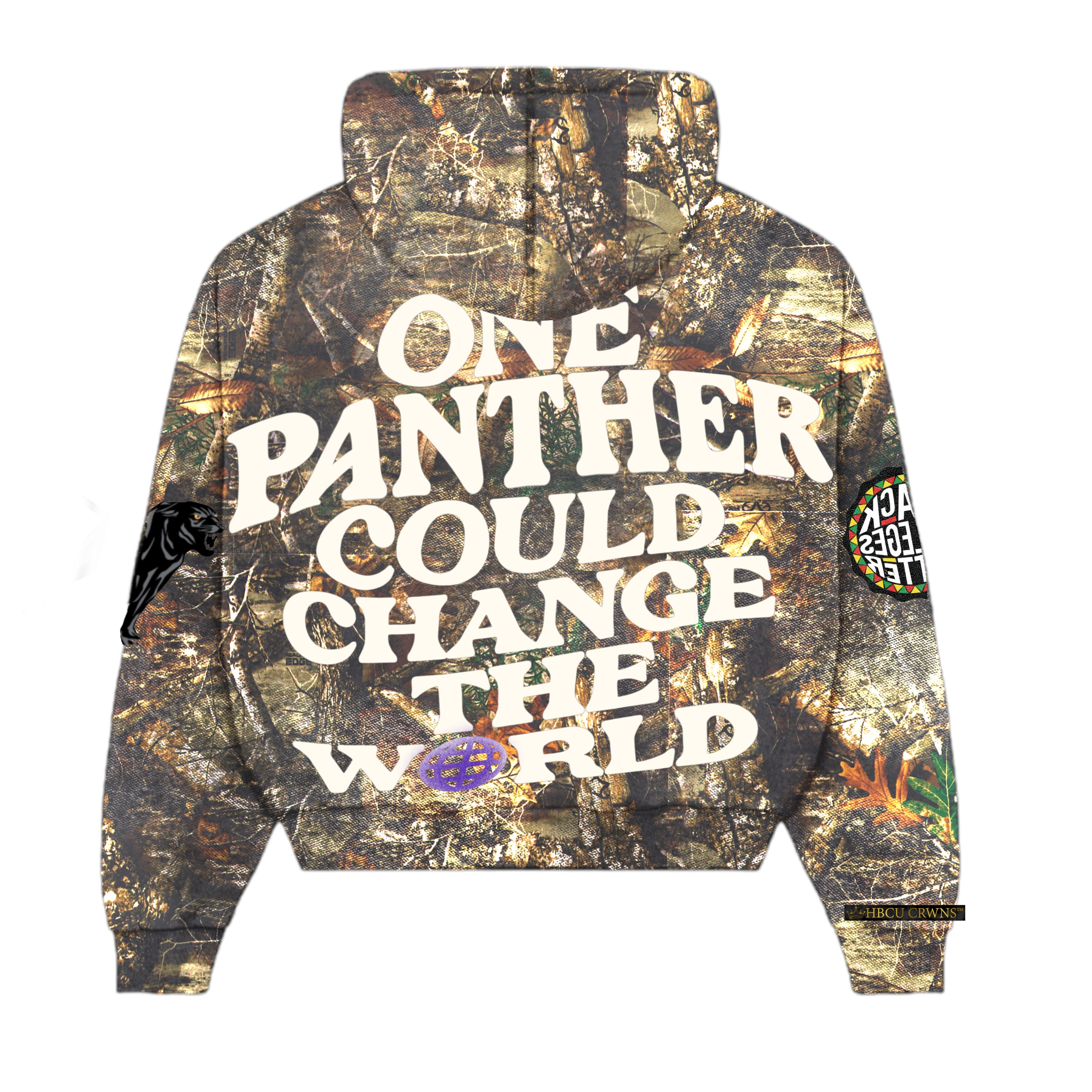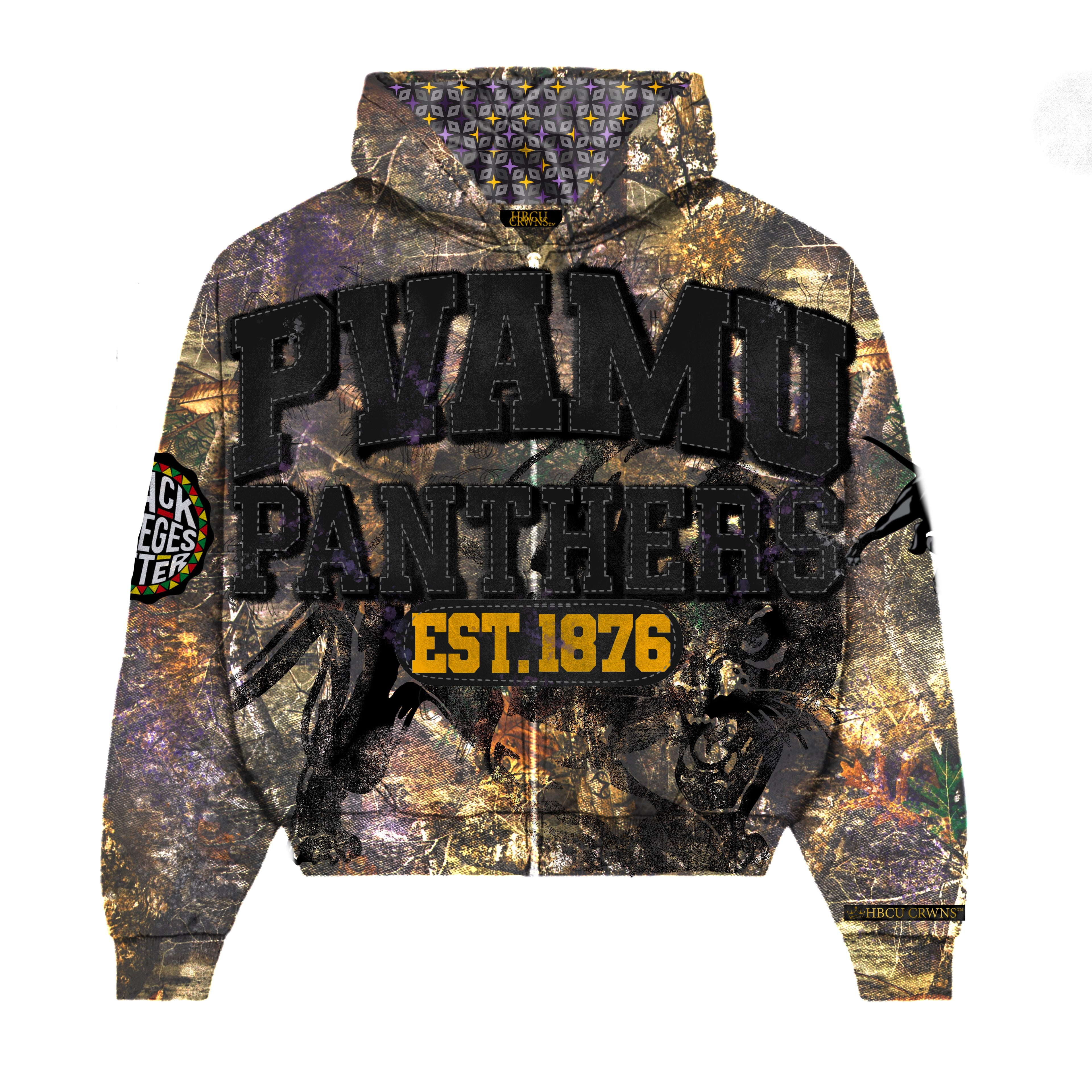 Purple and Gold power with distressed appliqué and silk hood lining. Back reads: “Panther Nation.” Designed for the hill, Panther Stadium Saturdays, and Prairie View Homecoming nights.