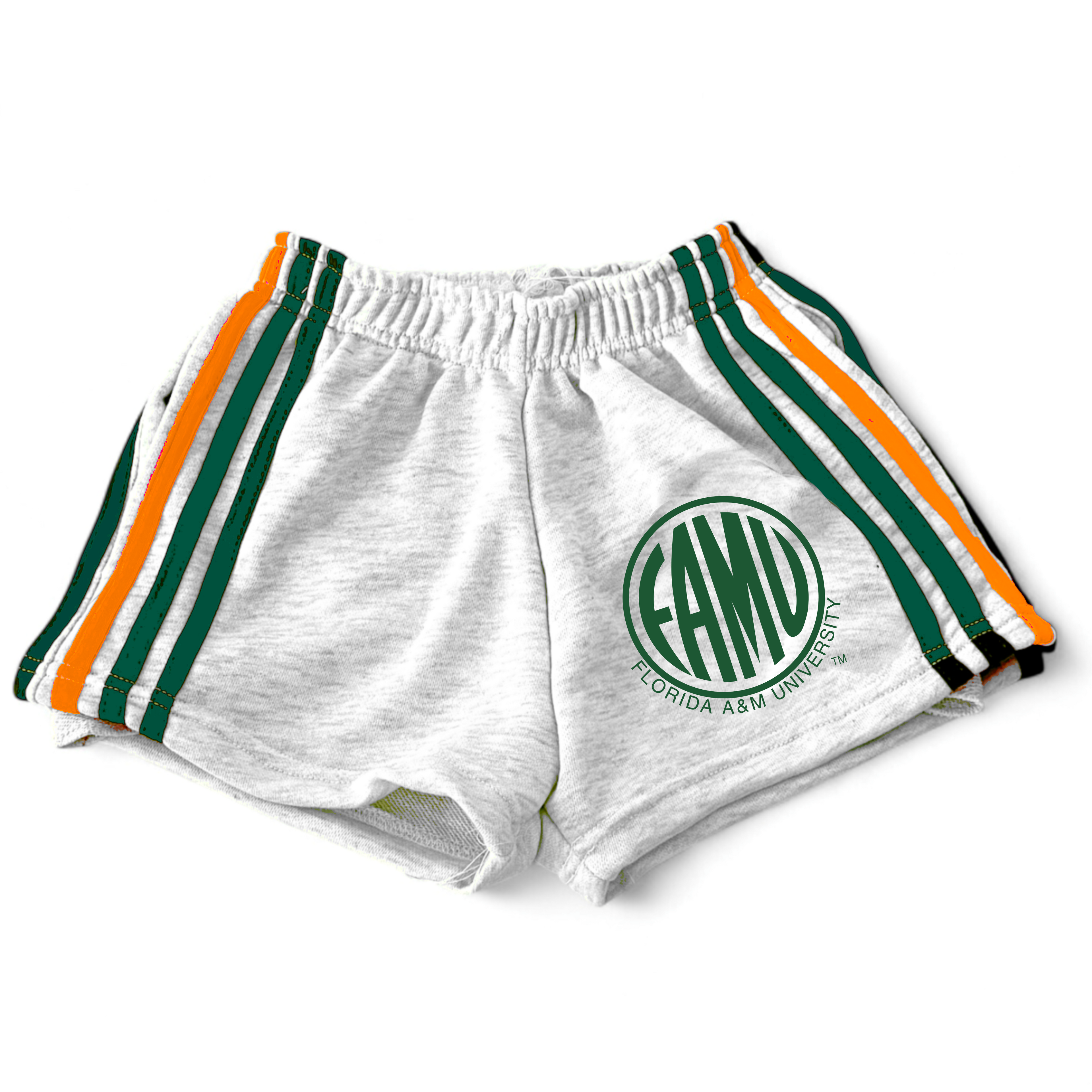 Light grey cropped shorts accented with bold orange and green triple stripes down the sides. Finished with the official FAMU circular logo on the left leg. Designed as the perfect match to the FAMU Lifestyle Jacket and Striped Sweatpants.