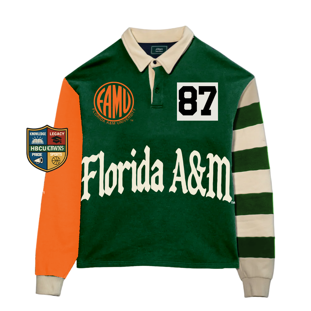 Dark green rugby polo with cream collar, striped sleeve, and bold distressed appliqué “Florida A&M” across the chest. Featuring the official FAMU circular patch, the founding year number 87, and contrasting sleeves for a heritage-meets-streetwear look.