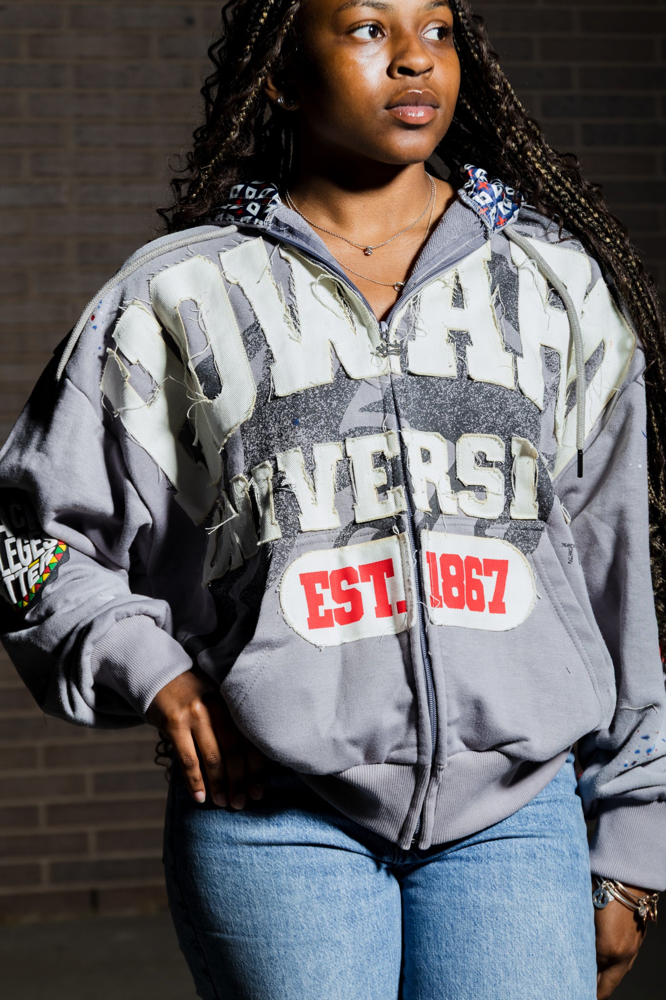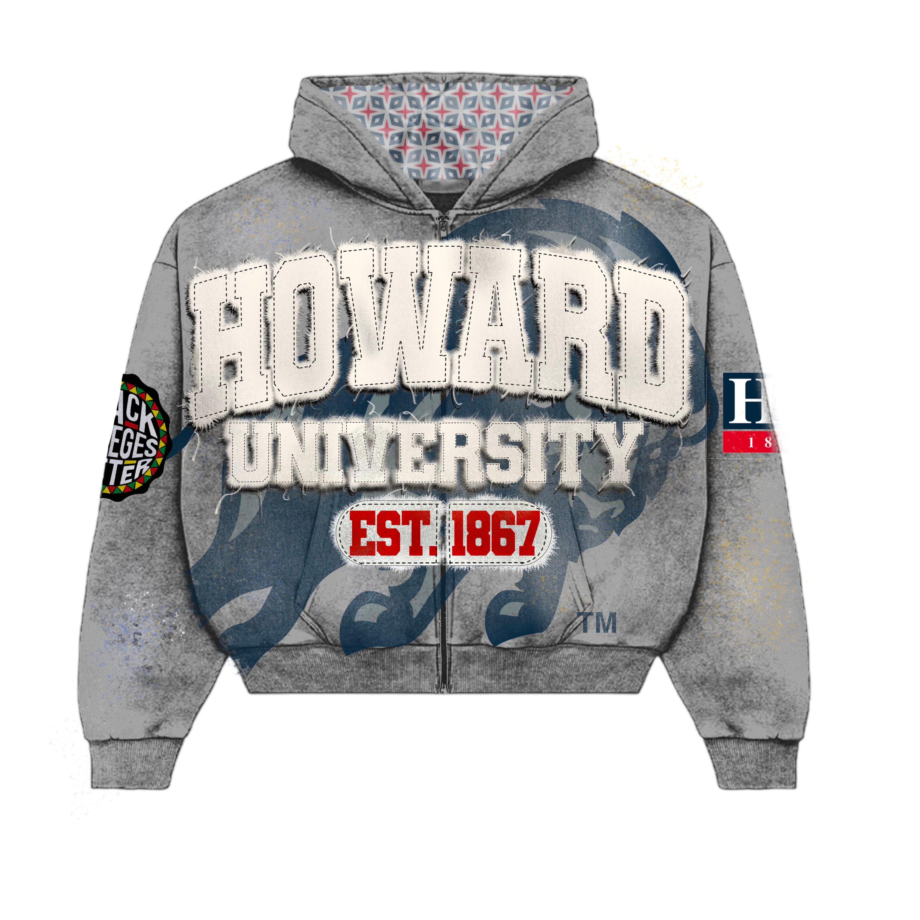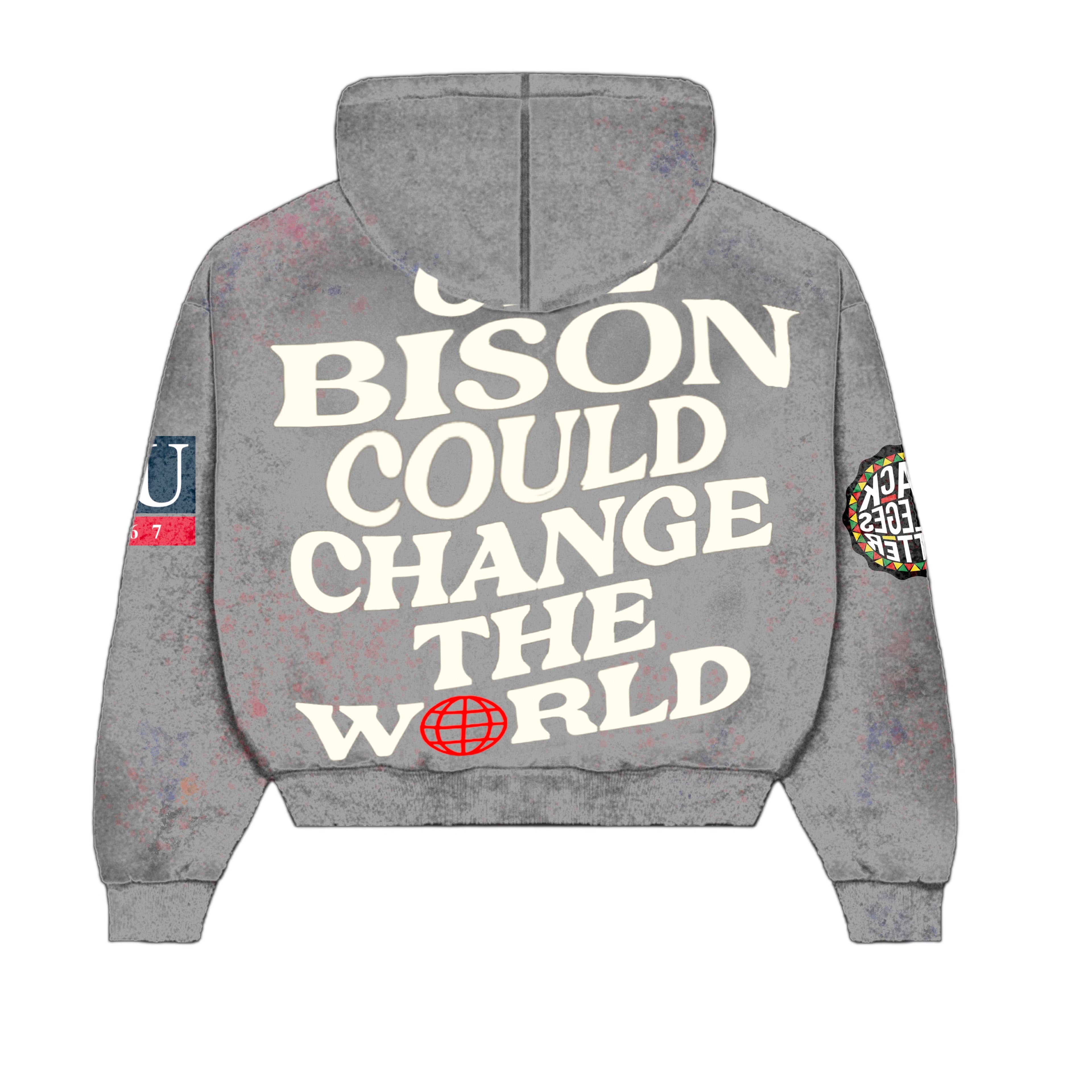 Classic Bison Grey with bold white appliqué, silk-lined hood for crown protection, and statement graphics rooted in the Mecca. Back reads: “One Bison Could Change the World.” Designed for the Hilltop, Homecoming yard, and beyond.