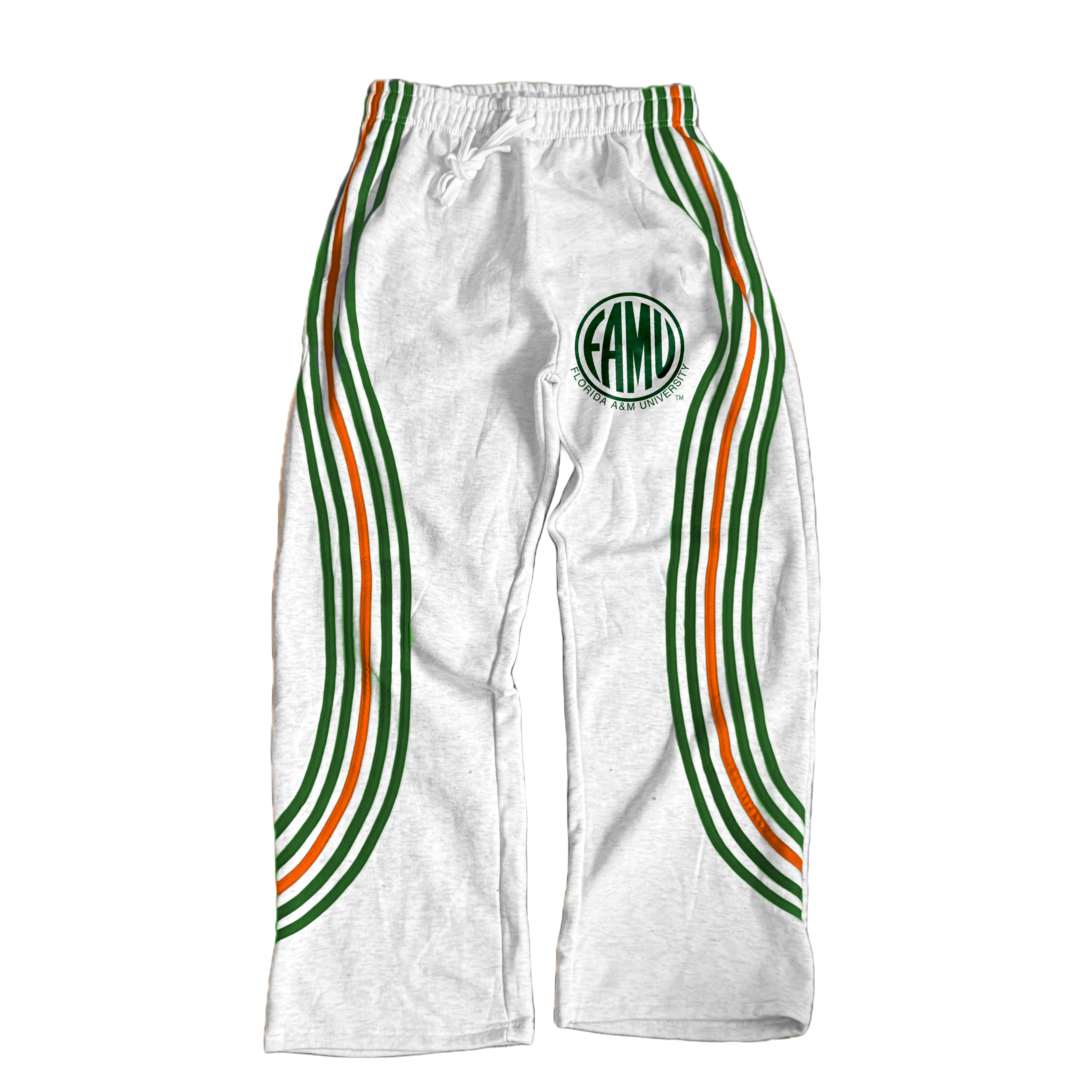 Classic white French terry sweatpants accented with bold orange and green racing stripes down each leg, finished with a silk-infused waistband for unmatched comfort. Featuring the official circular FAMU logo at the hip. Designed as the perfect match to the FAMU Lifestyle Jacket.