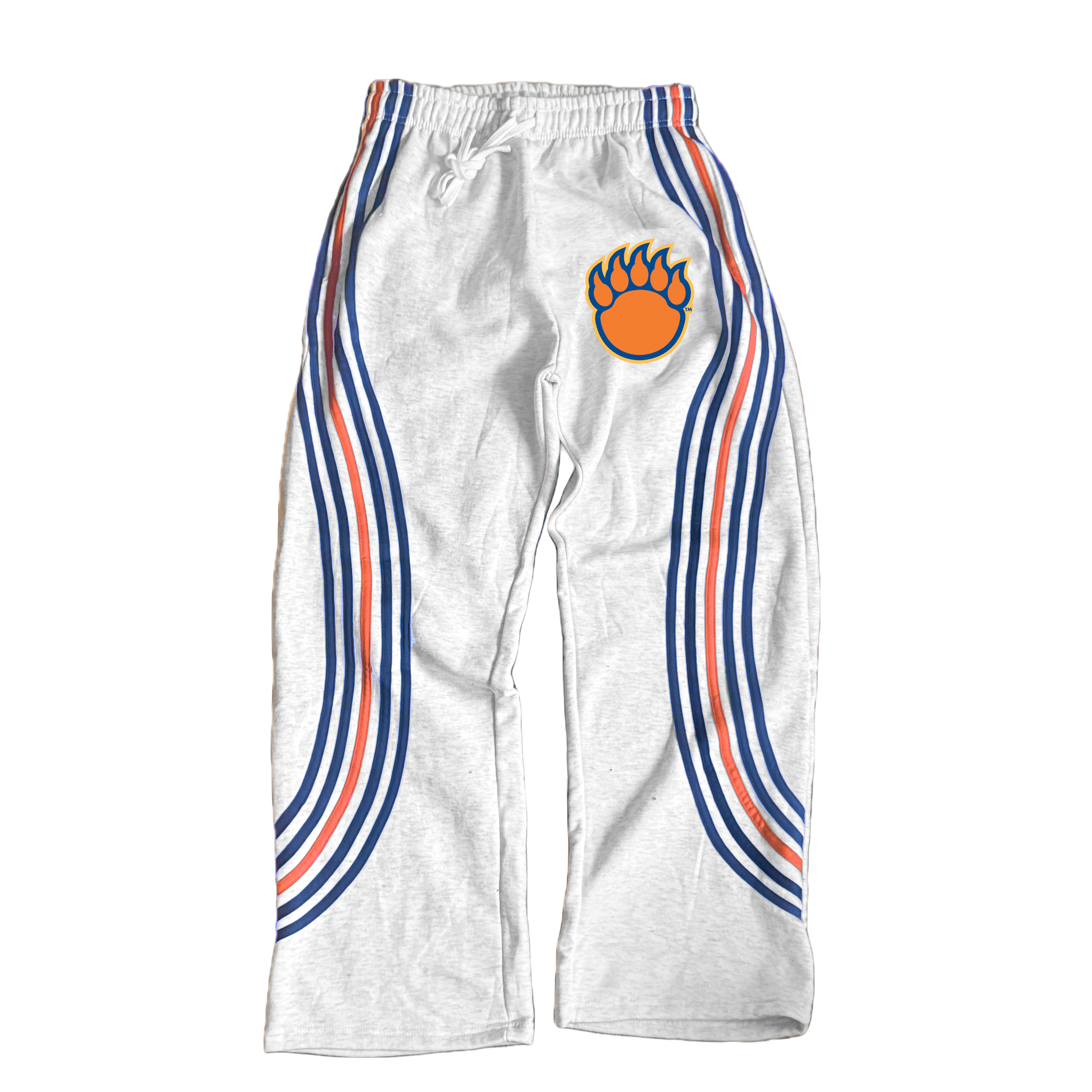 White sweatpants with bold Blue and White side striping and Bear detailing. Designed for the Yard, Hughes Stadium Saturdays, and Morgan Homecoming week.