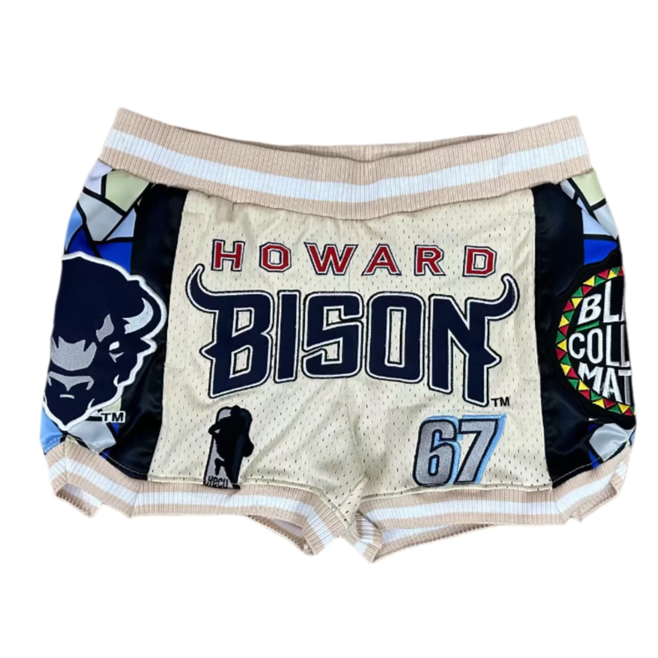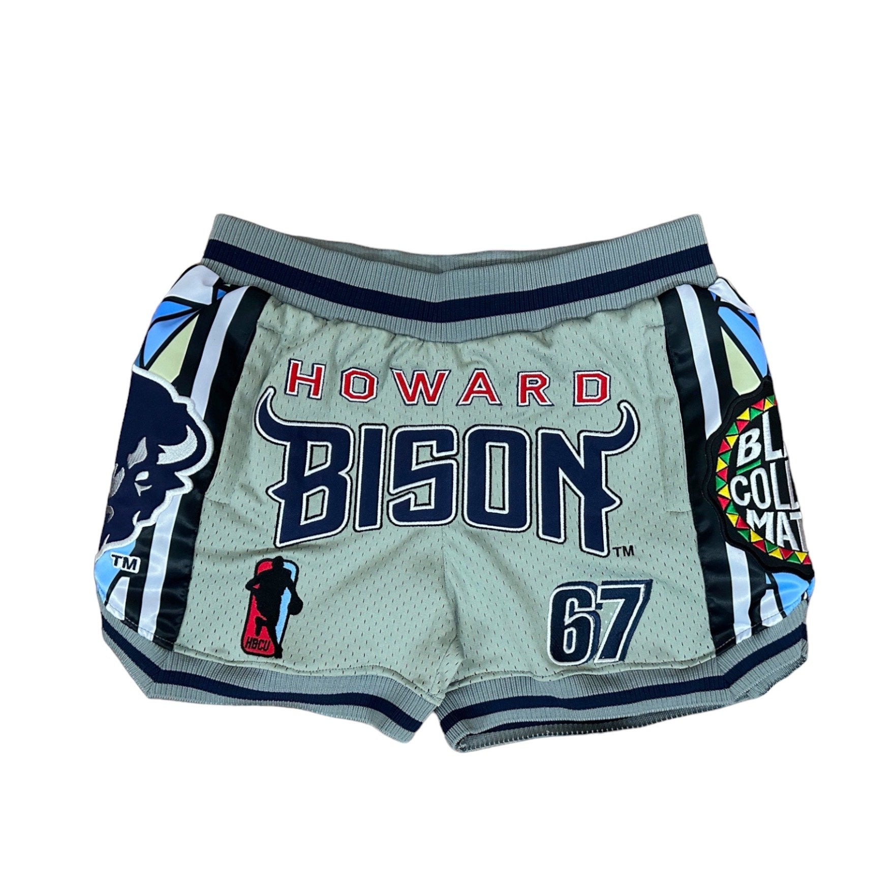 Light grey mesh basketball shorts with bold “Howard Bison” wordmark across the front, complete with heritage patches and cultural detailing. Featuring the 67 patch for Howard’s founding year, the Bison head graphic, and a “Black Colleges Matter” patch on the side panel. Designed for the court, the yard, and The Mecca’s Homecoming style.