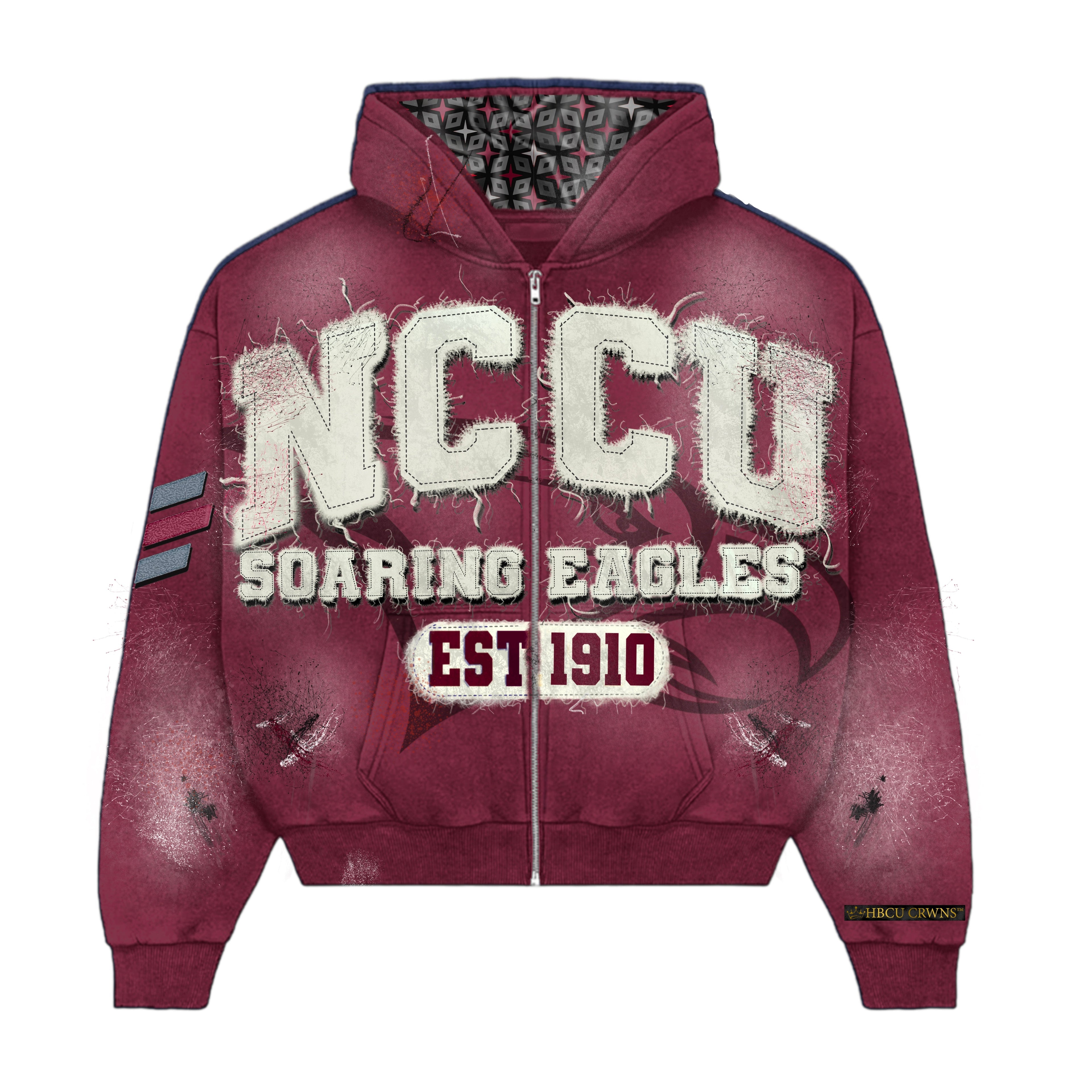Rich maroon with distressed appliqué lettering and silk-infused hood lining for crown protection. Front features “NCCU Soaring Eagles” with EST. 1910 heritage detail, while the back reads: “One Eagle Could Change the World.” Designed for the yard, O’Kelly-Riddick Stadium, and NCCU Homecoming nights.