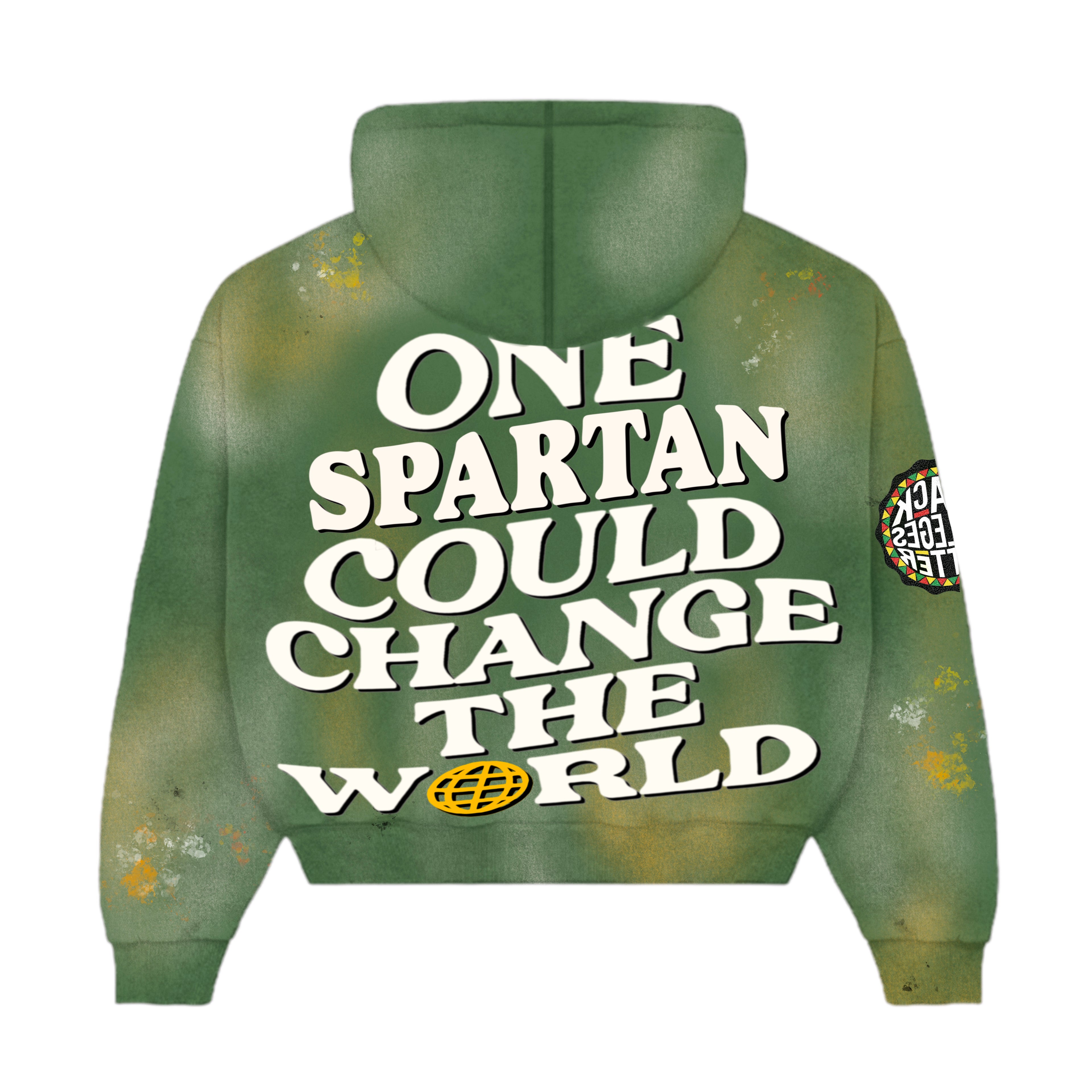 Aggressive Spartan green with bold appliqué details and silk hood lining. Back reads: “One Spartan Could Change the World.” Designed for the yard, game days, and homecoming nights.