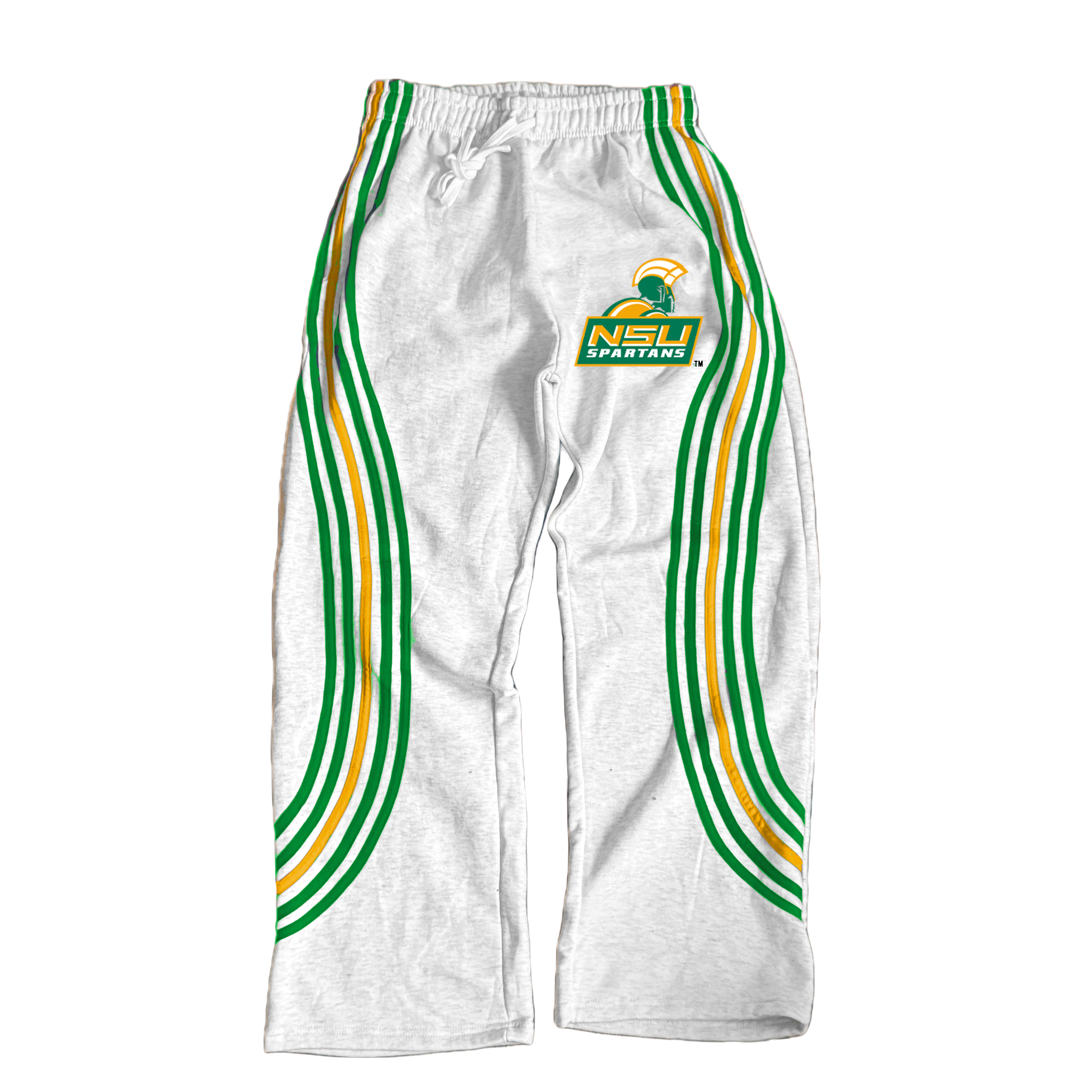 White sweatpants with bold Gold and Green side striping plus and NSU detailing. Designed for the Yard, Dick Price Stadium Saturdays, and Norfolk State Homecoming nights.