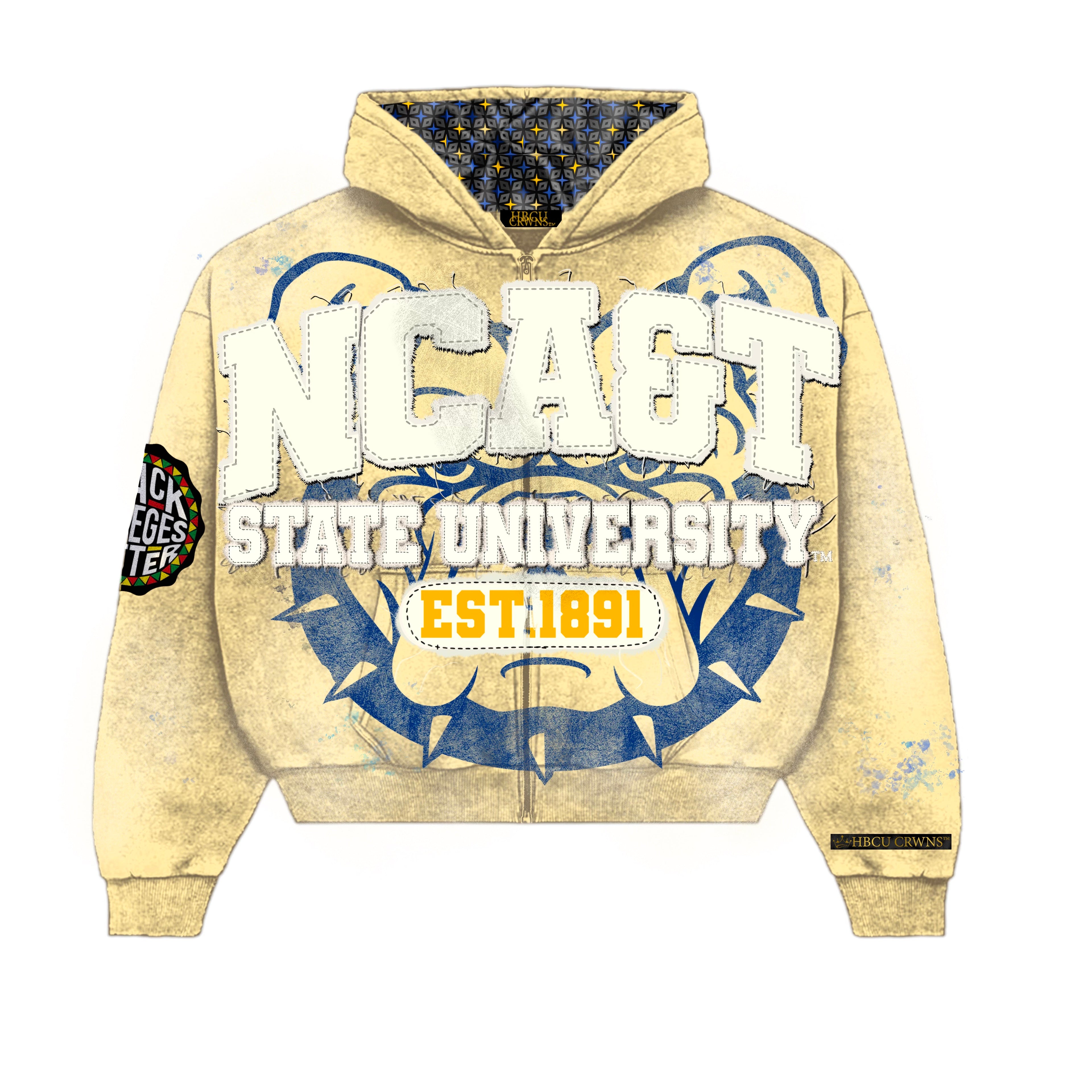 Distressed stitched appliqué lettering that honors NC A&T with bold, hand-crafted detail.