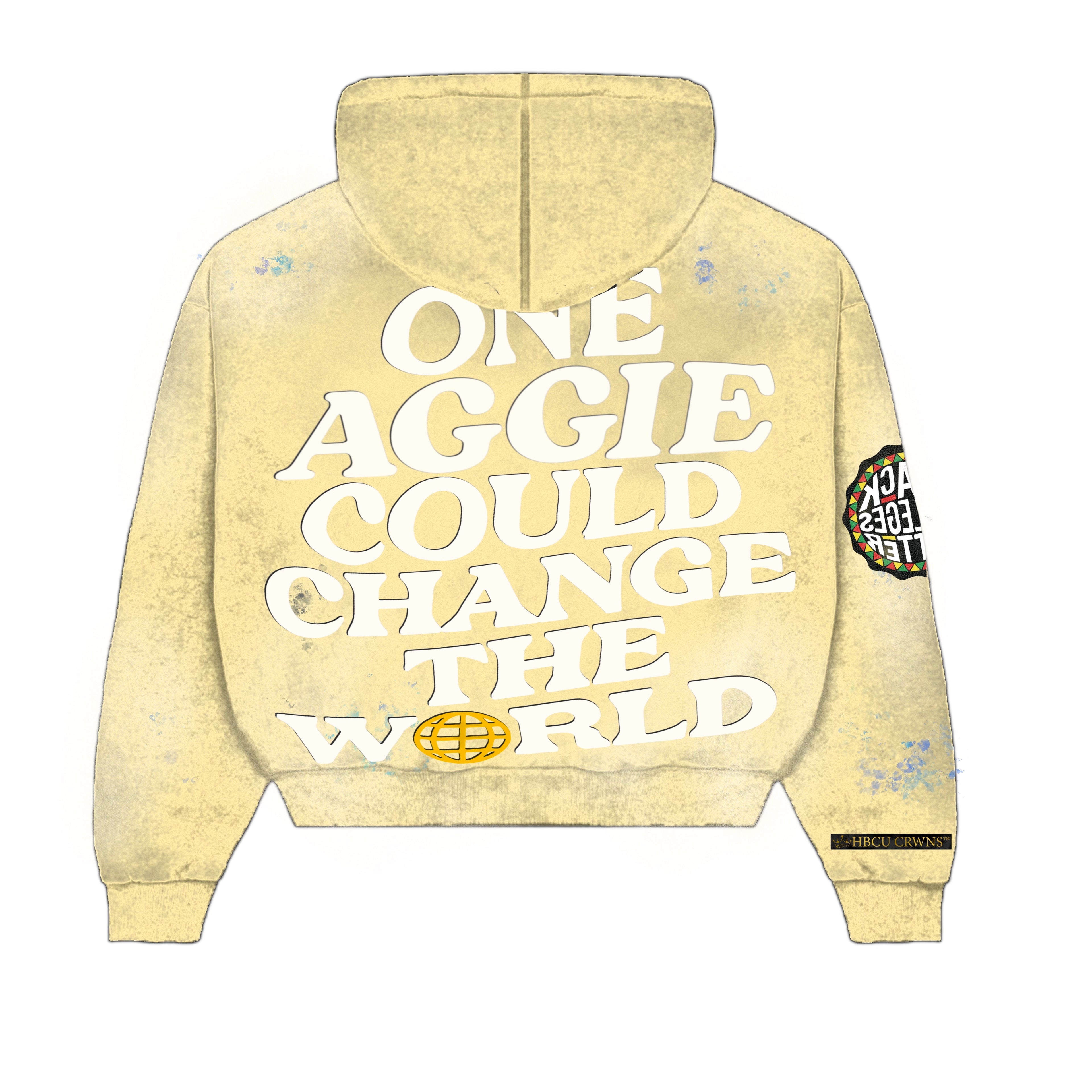 “Light Lèmon” French Terry Cotton with white appliqué, silk-infused hood lining, and detailed logos built for Aggie Pride. Back reads: “One Aggie Could Change the World.” Crafted for the Greatest Homecoming on Earth.