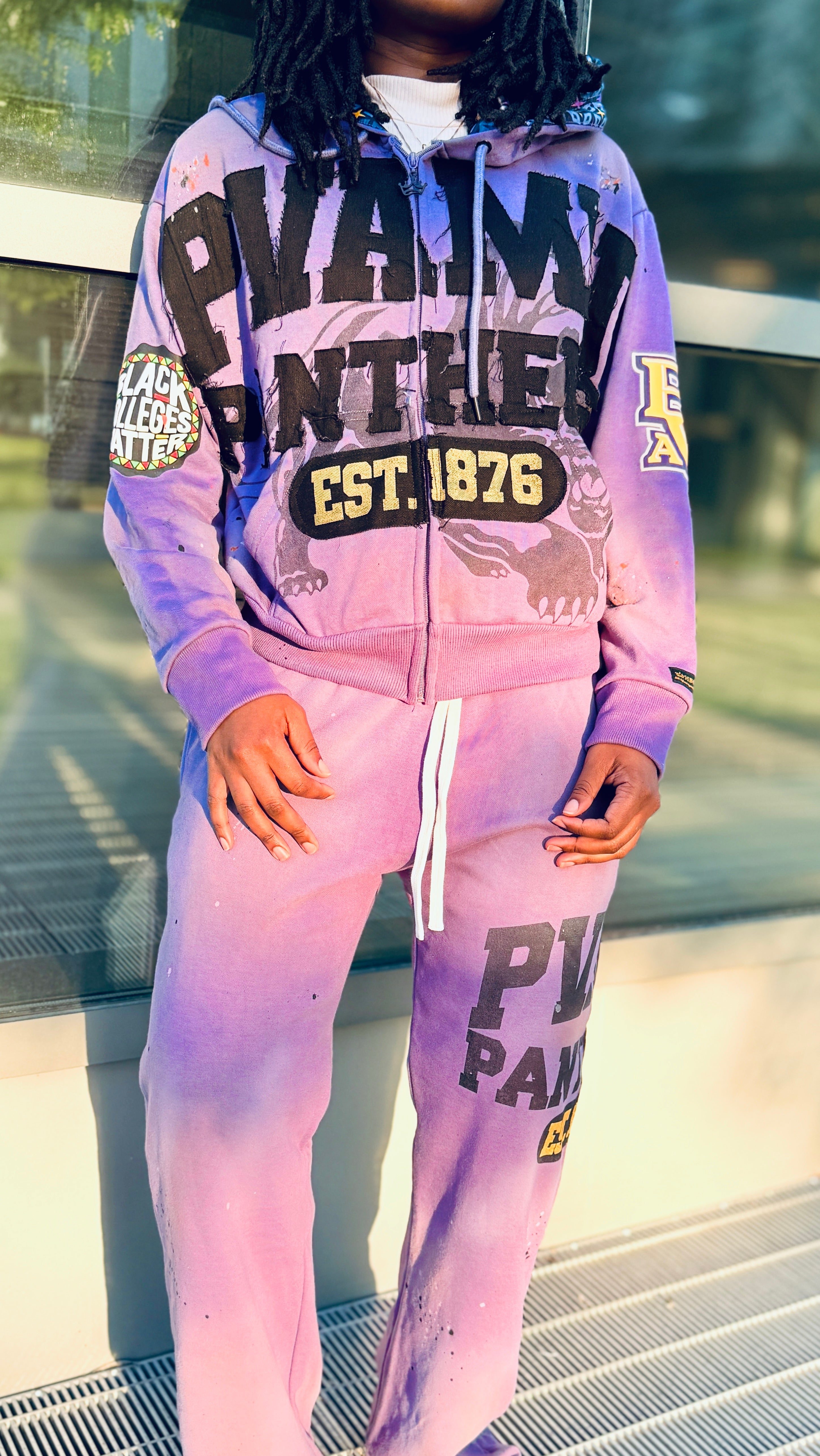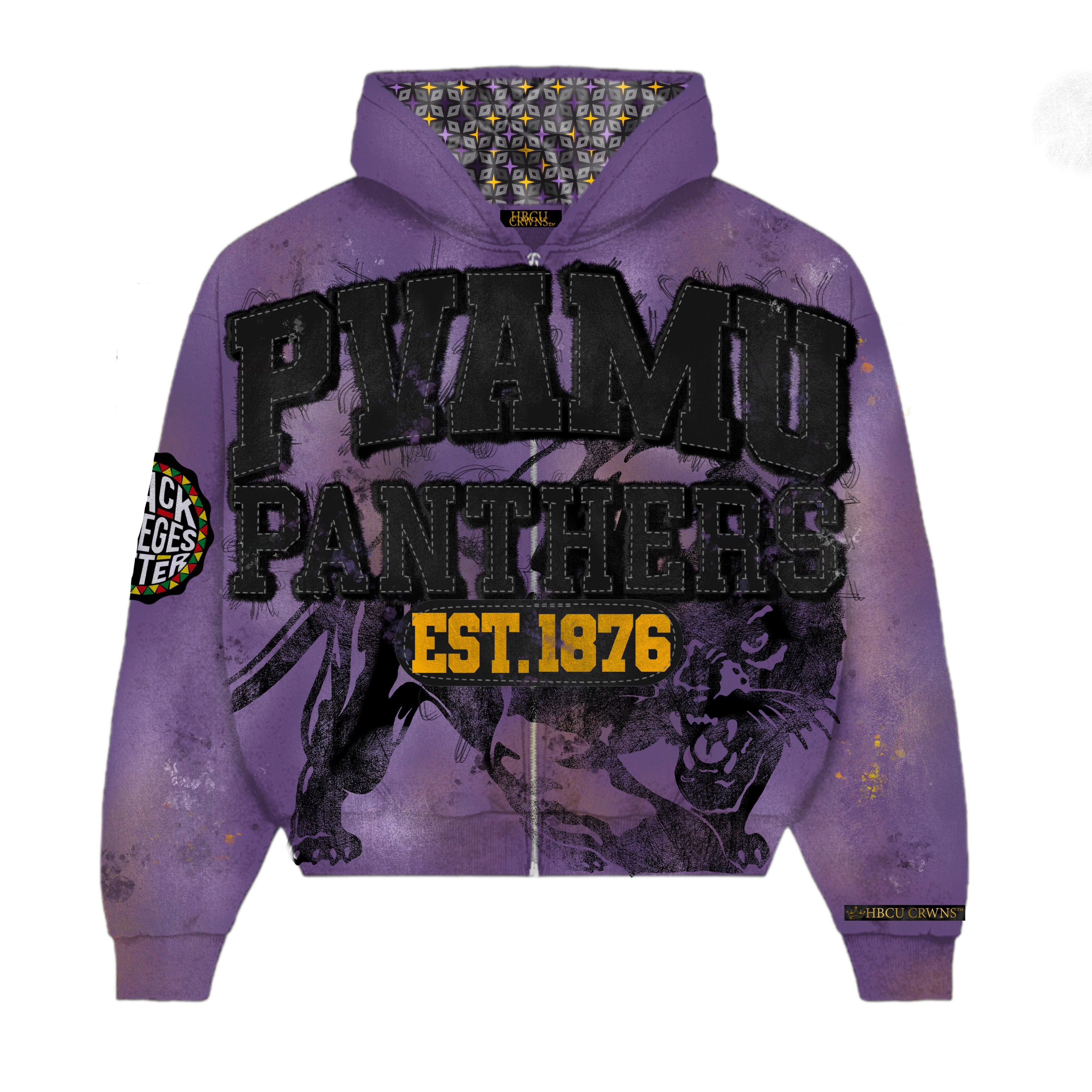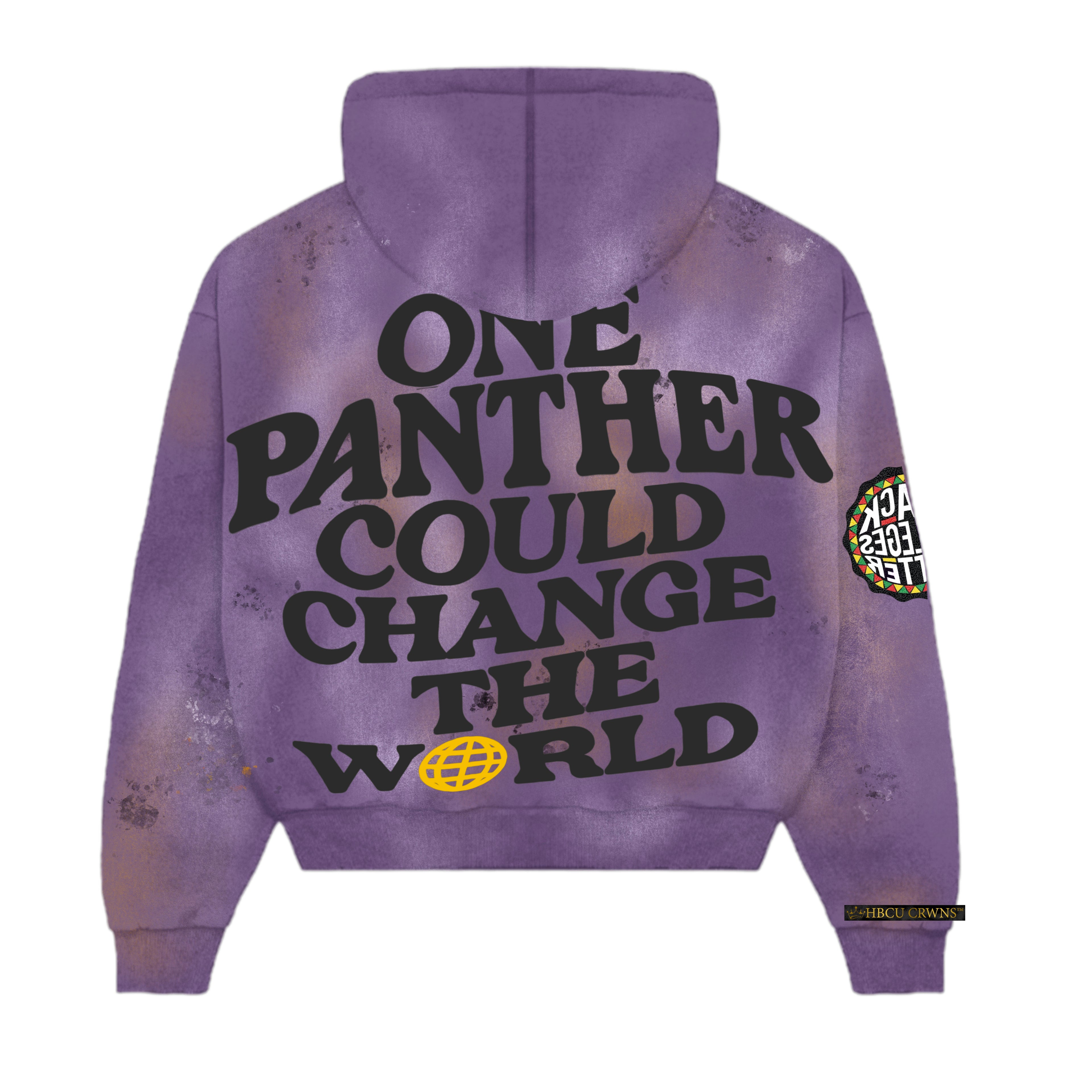 Rich Prairie View purple with bold gold distressed appliqué lettering and silk-infused hood lining for crown protection. Front features “Prairie View A&M” with EST. 1876 heritage detail, while the back reads: “One Panther Could Change the World.” Designed for the yard, the game, and Prairie View’s legendary Homecoming nights.