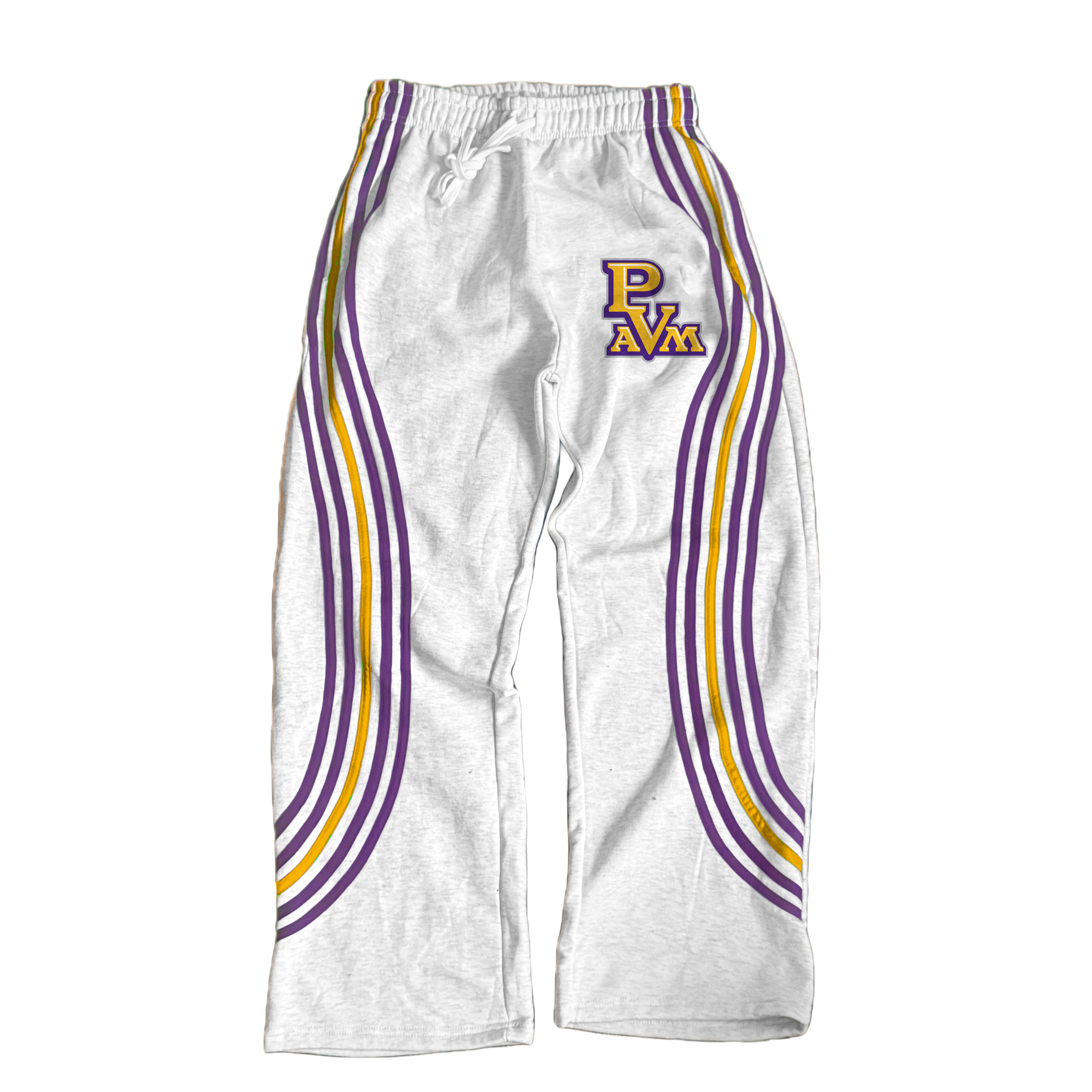 White sweatpants with bold Gold and Purple side striping plus and Panther detailing. Designed for the Hill, Panther Stadium Saturdays, and PVAMU Homecoming nights.