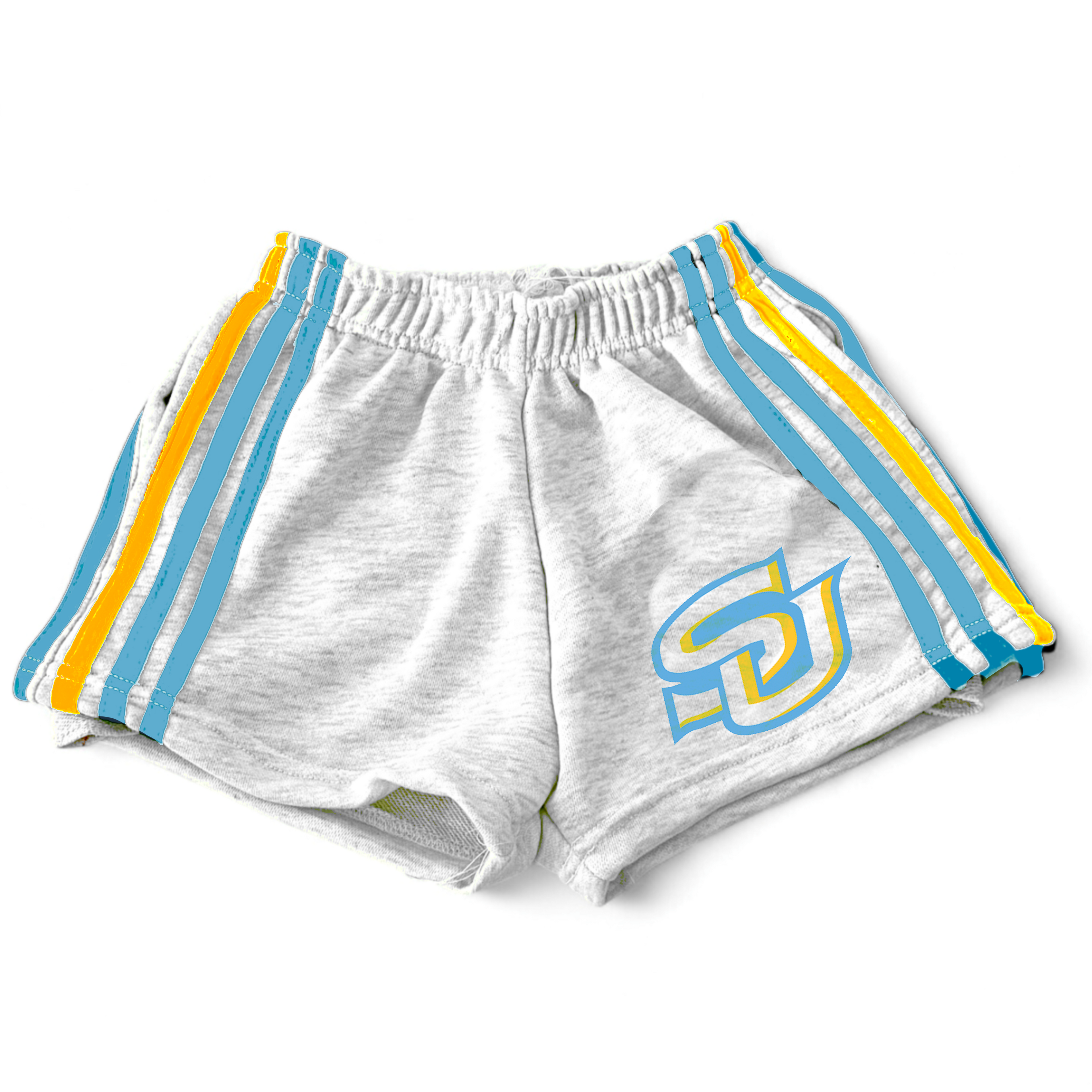 Columbia Blue cropped shorts with bold Gold and White side striping plus distressed appliqué lettering and Jaguar detailing. Designed for the Yard, Mumford Stadium Saturdays, and Southern Homecoming nights.