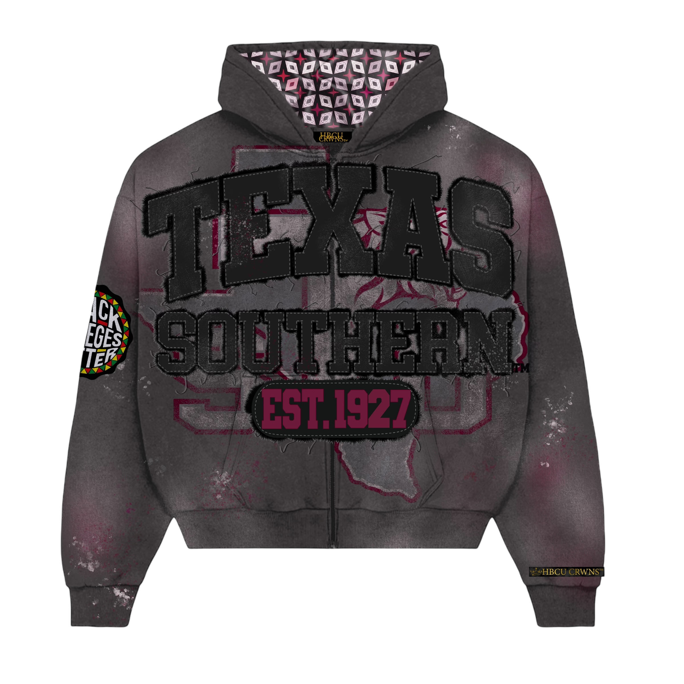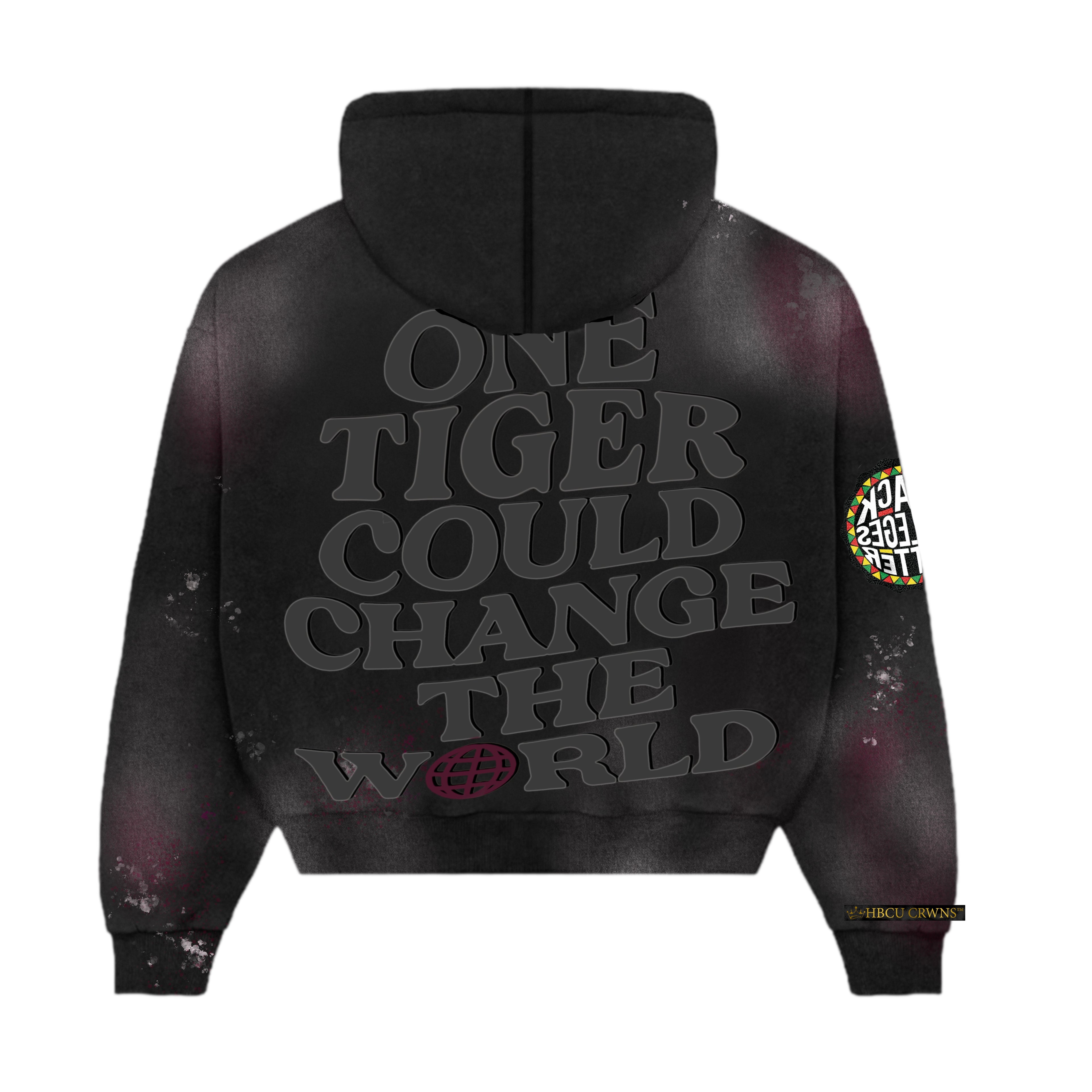 Dark storm-washed grey with bold distressed appliqué lettering and silk-infused hood lining for crown protection. Front features “Texas Southern” with EST. 1927 heritage detail and state outline, while the back reads: “One Tiger Could Change the World.” Designed for the yard, the stadium, and Texas Southern Homecoming nights.