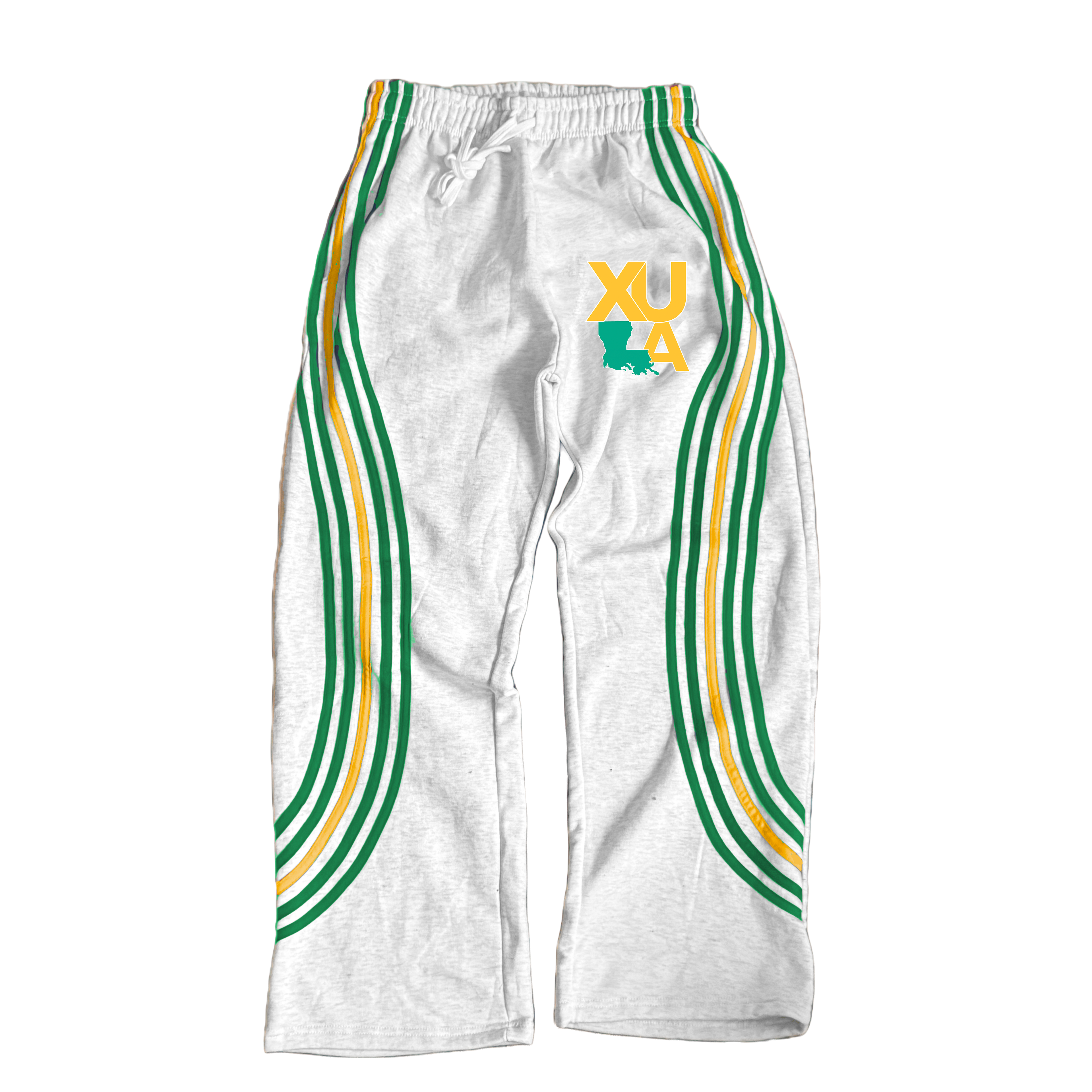 White sweatpants with bold Gold and green side striping and Gold Rush detailing. Designed for the Yard, Convocation Center game days, and Xavier Homecoming nights in New Orleans.